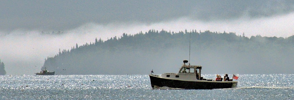 In the distance, gulls vie for bait as they circle a lobsterman pulling his traps. In the foreground a party boat carries its passengers to a picnic. The photo captures a moment where markedly different lifestyles briefly intersect. An unnoticed man is toiling at back breaking work in a smelly old lobster boat as others are chatting and photographing each other while enjoying a leisurely ride in an almost identical but “spruced up,” private launch.